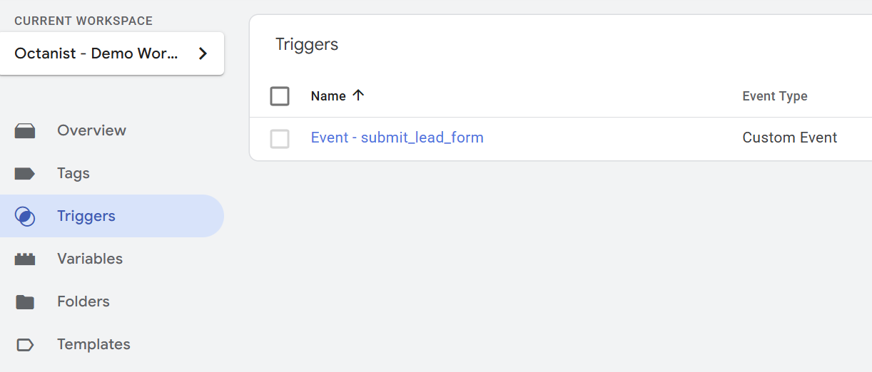 - Select the Custom Event for the submit_lead_form trigger, that we created in step 3.3