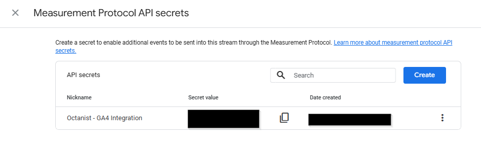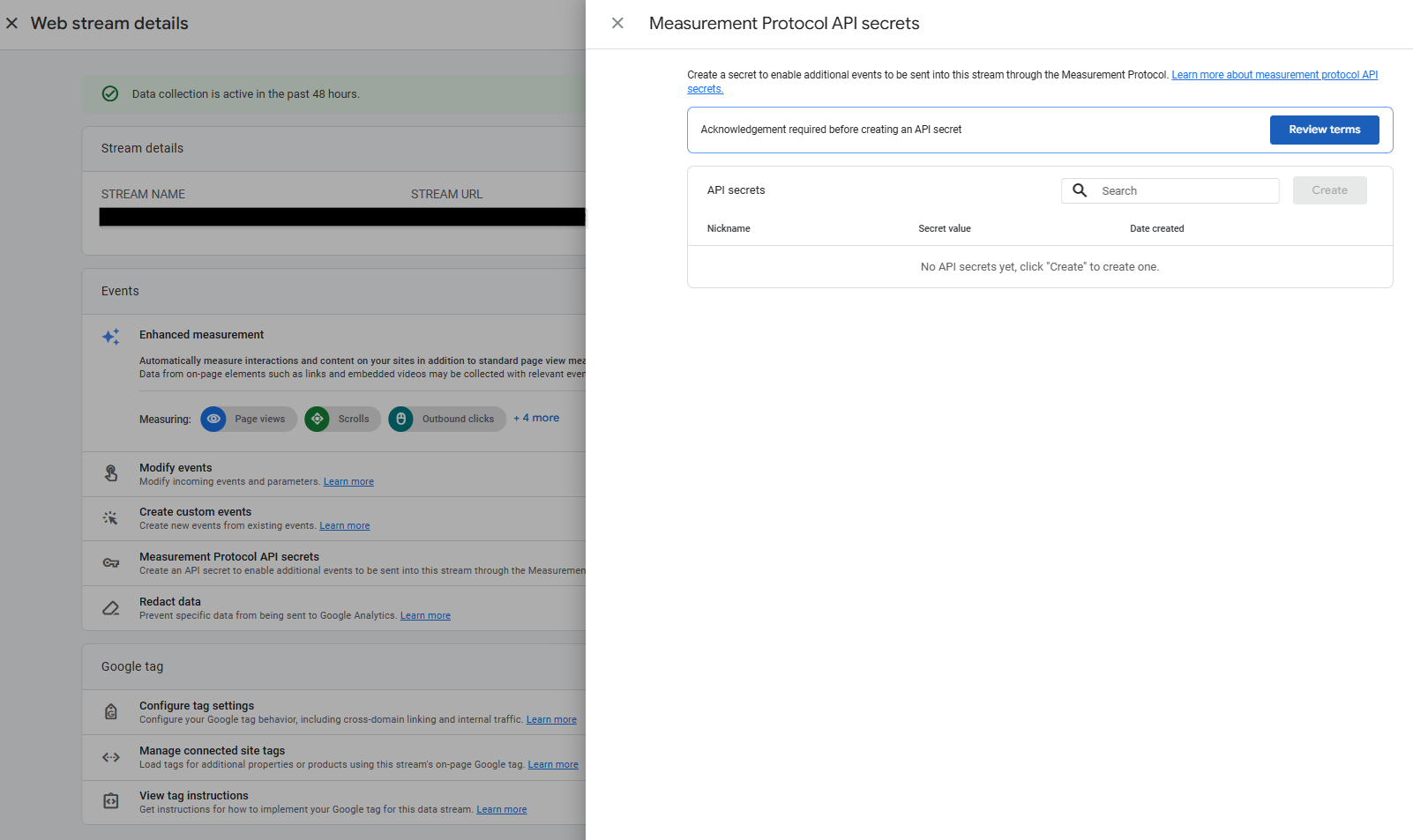 - In your GA4 Data Stream, click Measurement Protocol API Secrets.