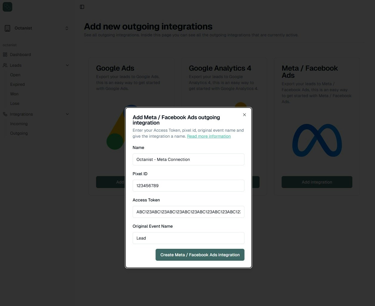 - Name: Choose a name for the integration (e.g., Octanist - Meta Integration).